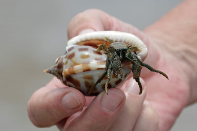 Zo was er een flinke strook met aangespoelde kleine visjes. Blijkbaar waren er nog genoeg over, want een hele kolonie sterns was boven zee op jacht en nam af en toe een rustpauze op het strand. We vonden een prachtige schelp op een stuk hout of zo, maar de schelp nam plots een loopje met ons: er bleek een heremietkreeftje in te zitten. Kleine krabbetjes graven zichzelf holletjes in het zand en maken daarmee de mooiste patronen. Kleine schelpjes en brokjes koraal lagen hier en daar, maar in geringe mate.