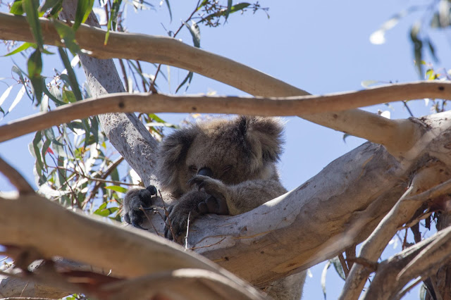 In een van de bomen op de parkeerplaats keek een klein koalabeertje slaperig op ons neer. Meer hebben we er hier niet gezien, omdat we na een bezoek aan het visitor centre naar de kaap zijn gereden. In de buurt van het centrum gaan de bossen nog wel de lucht in, hier en daar steekt er een mooie, sierlijke eucalyptus bovenuit, maar naarmate we de rand van de kaap naderden, werden de planten lager.